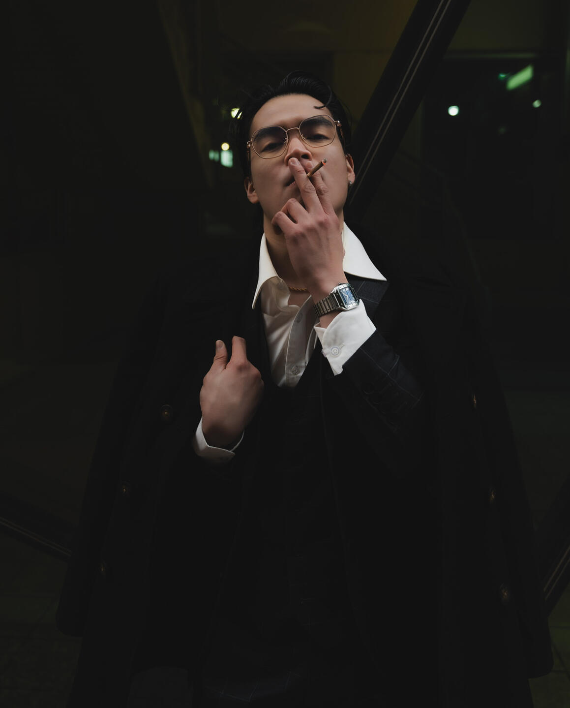 "With a refined taste for nostalgia, he selected a pair of trousers, a crisp dress shirt adorned with cufflinks, and suspenders that held together the ensemble with a touch of old-world charm, all while enjoying the rich flavor of his favorite cigar. In the quiet elegance of his preparation, he found himself in solitude beneath the soft glow of a crimson dawn."